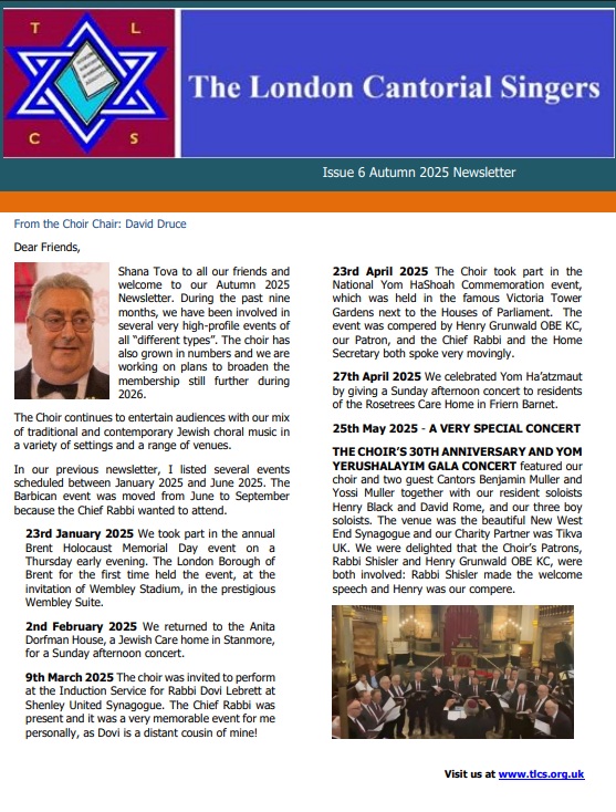 The London Cantorial Singers has launched a scholarship fund to give Jewish youngsters, who love singing, the opportunity to experience high quality choral singing and to offer the successful candidates professional voice coaching and music training. Candidates should be between 9 to 14 years old and be living in the Greater London area. For more details click here.